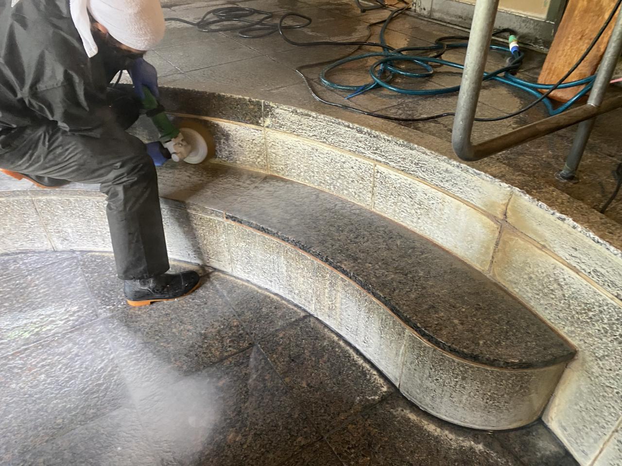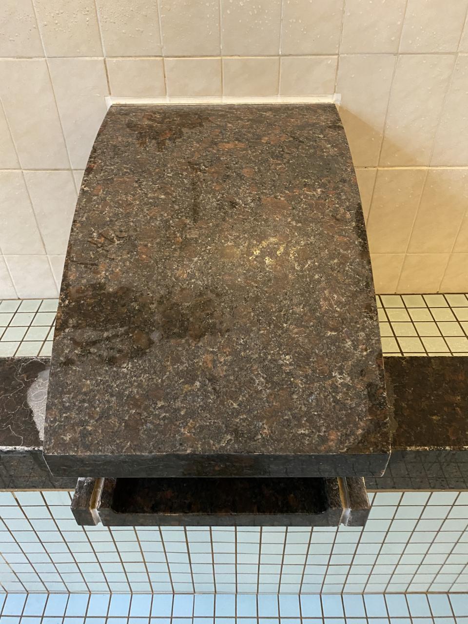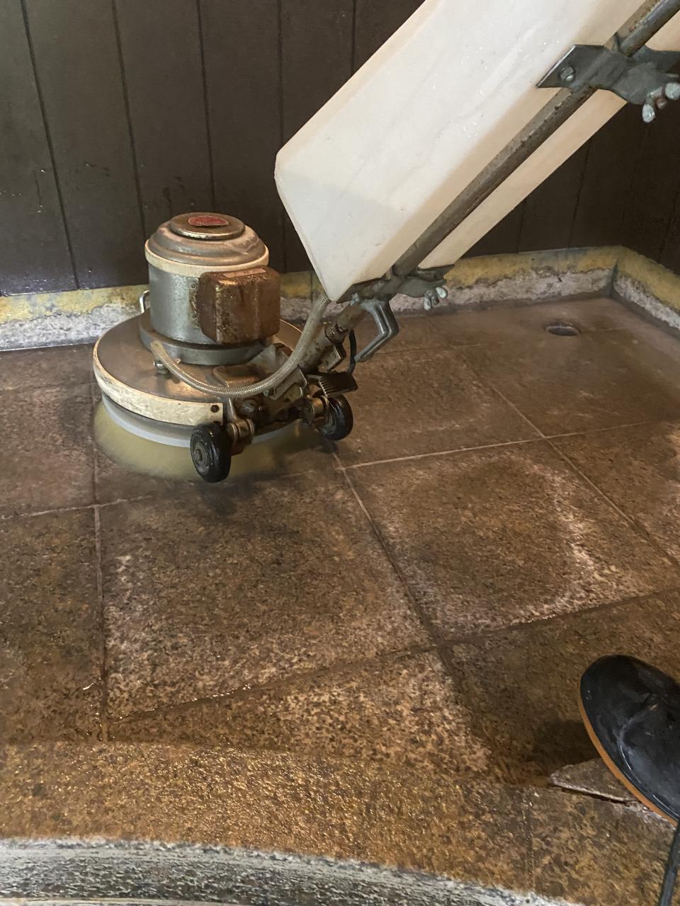 長年の汚れを特殊洗剤とダイヤモンドパッドで露天風呂 壁・床・石面・タイル面の白華や長年の汚れを除去してきました。