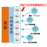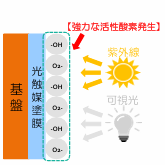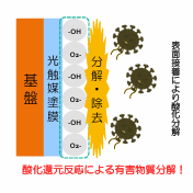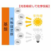 A.光触媒とは、光を照射することにより触媒作用を示す物質の総称で、酸化チタンという金属酸化物からなるものです。光があたると酸化チタン表面に活性酸素が生み出され、その活性酸素が有害物質を酸化分解を起こします。このサイクルで金属酸化物がすり減っていくことはありません。ゆえに、塗膜がある限り半永久、ということです。ただし塗膜が剥がれる条件もあるため、全てが半永久と謳うことはできません。